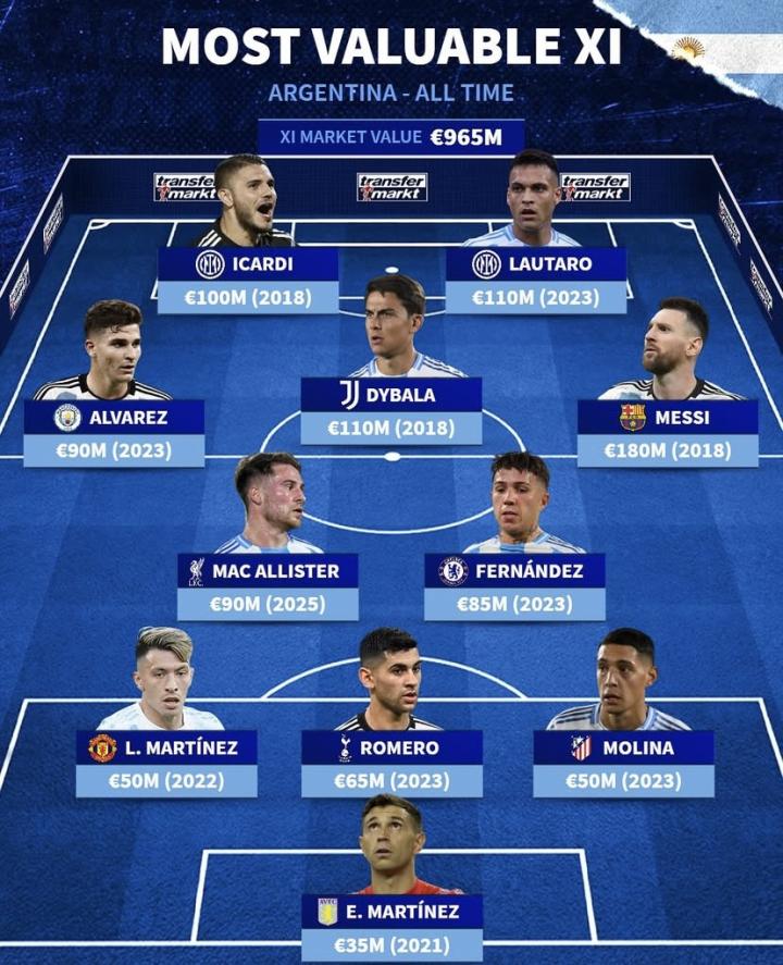 首先,让我们来看看阿根廷历史最贵11人阵容。在门将位置上,达米安-马丁内斯、莫利纳和利桑德罗-马丁内斯等球员的身价都在5000万到6500万欧元之间。身价最高的球员当属梅西,他在2018年曾经一度身价达到了1.8亿欧元,是阿根廷足球的象征。此外,迪巴拉、胡利安-阿尔瓦雷斯、劳塔罗等球员身价也均在1亿欧元以上。阿根廷的这支11人阵容无疑汇聚了众多顶级球星,他们的实力不容小觑,将给巴西队带来不小的压力。