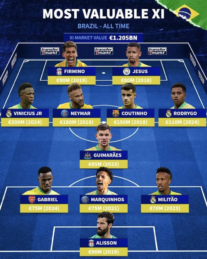 而巴西的历史最贵11人阵容同样实力非凡。在门将位置,阿利松是一名身价高达9000万欧元的门将。在后防线上,米利唐、马尔基尼奥斯和加布里埃尔等球员身价也都在7000万到7500万欧元之间。而维尼修斯,作为目前德转身价最高的球员,其身价高达2亿欧元,在巴西队中发挥着举足轻重的作用。此外,内马尔、库蒂尼奥、罗德里戈等球星也都是巴西队不可或缺的一员,他们的实力和经验将对阵容起到关键作用。总的来看,巴西队凭借着12.05亿欧元的总身价,实力不容小觑,将是一支非常强大的对手。